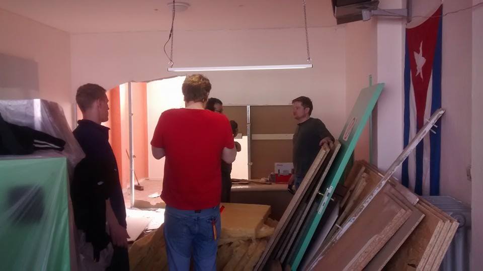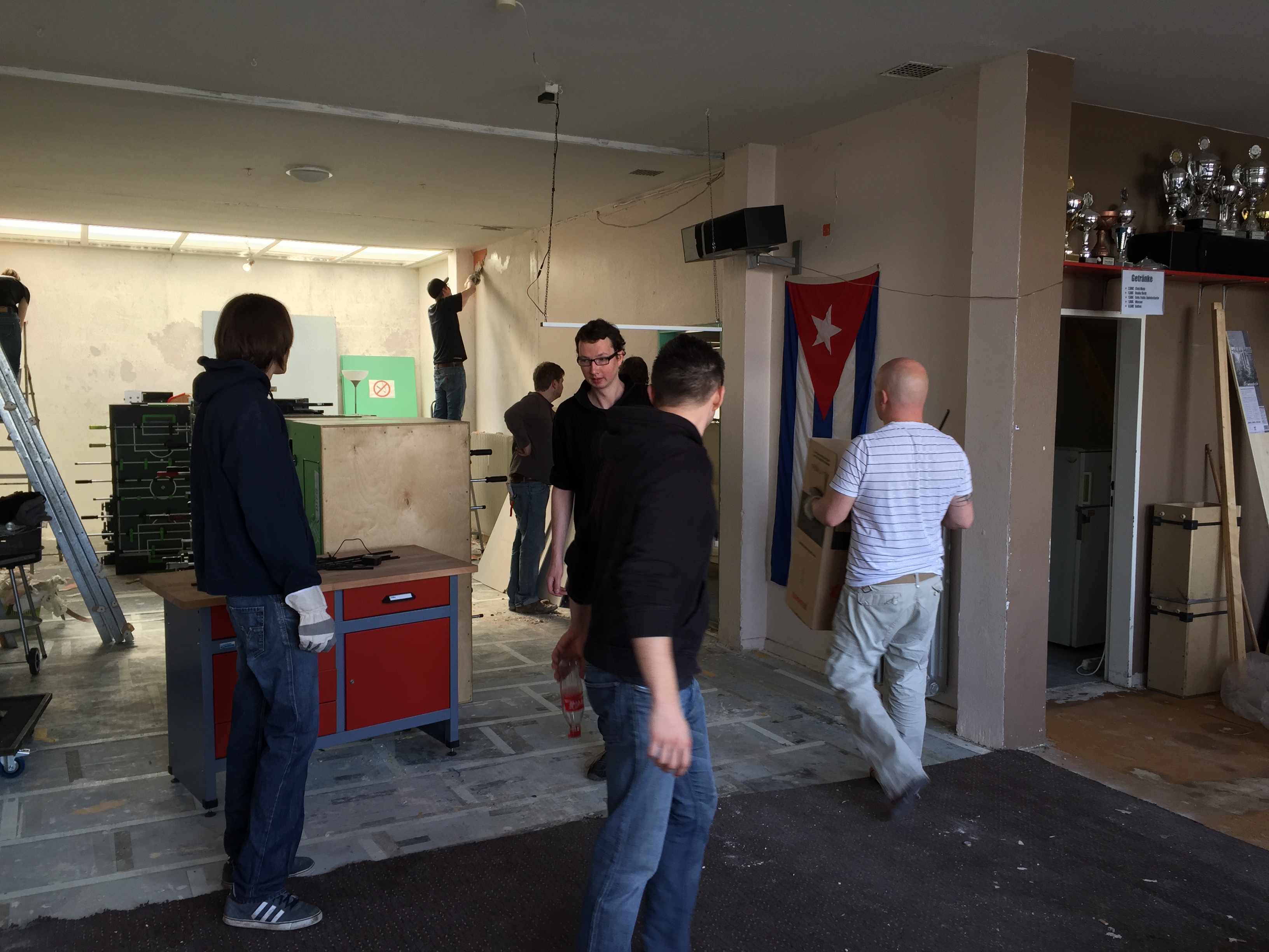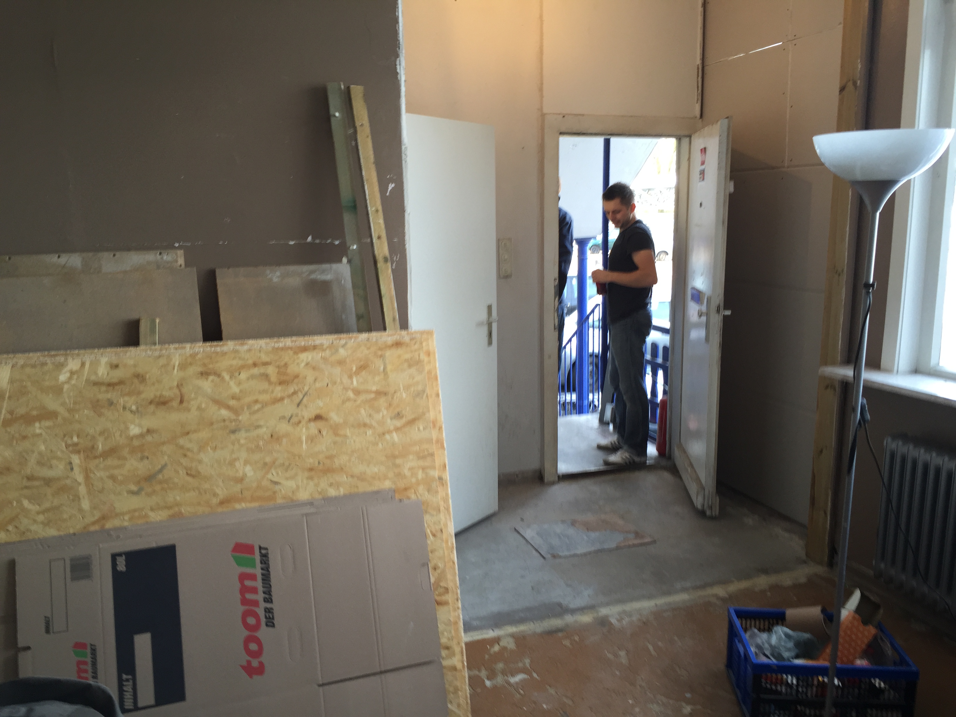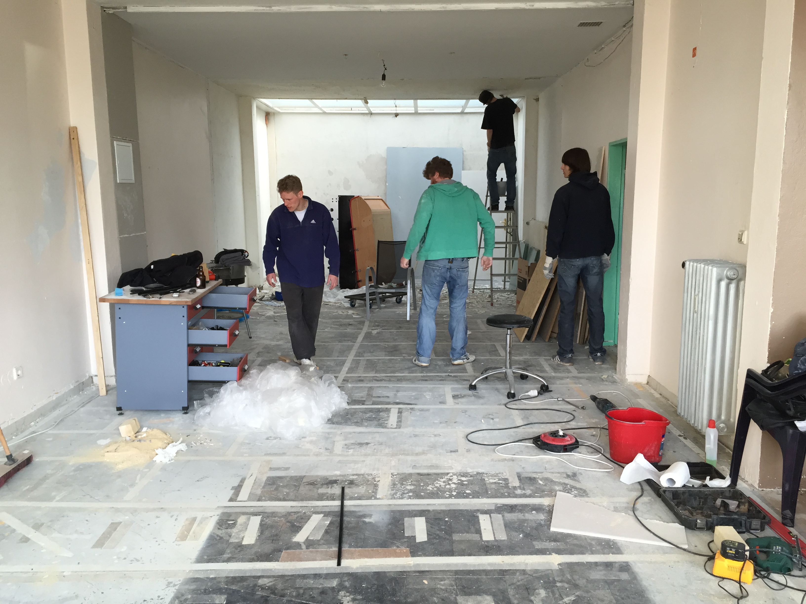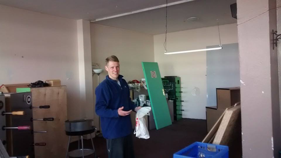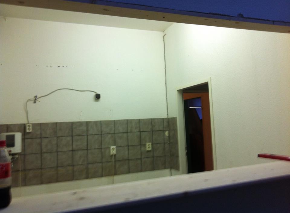 Am Donnerstag sah noch alles wie immer aus. Der geliebte süffige Boden, das ranzige Gardinengut, das Dyp-Final-Podest… Und schon heute ist alles in Schutt und Asche. Ein Container und ein Pferdeanhänger wurden voll gemacht. Alles Alte raus und Platz fürs Neue.