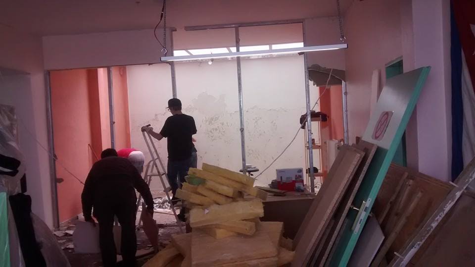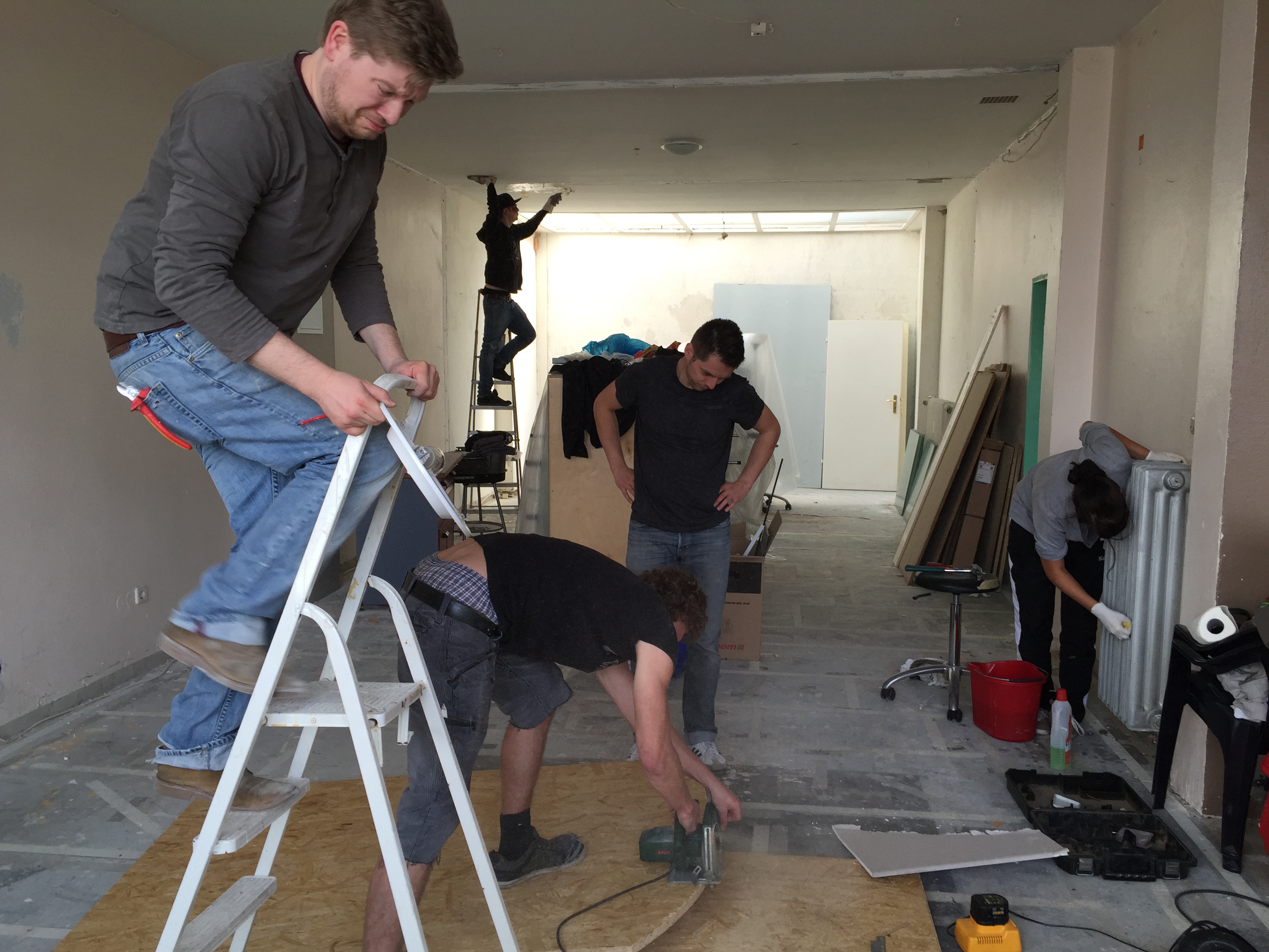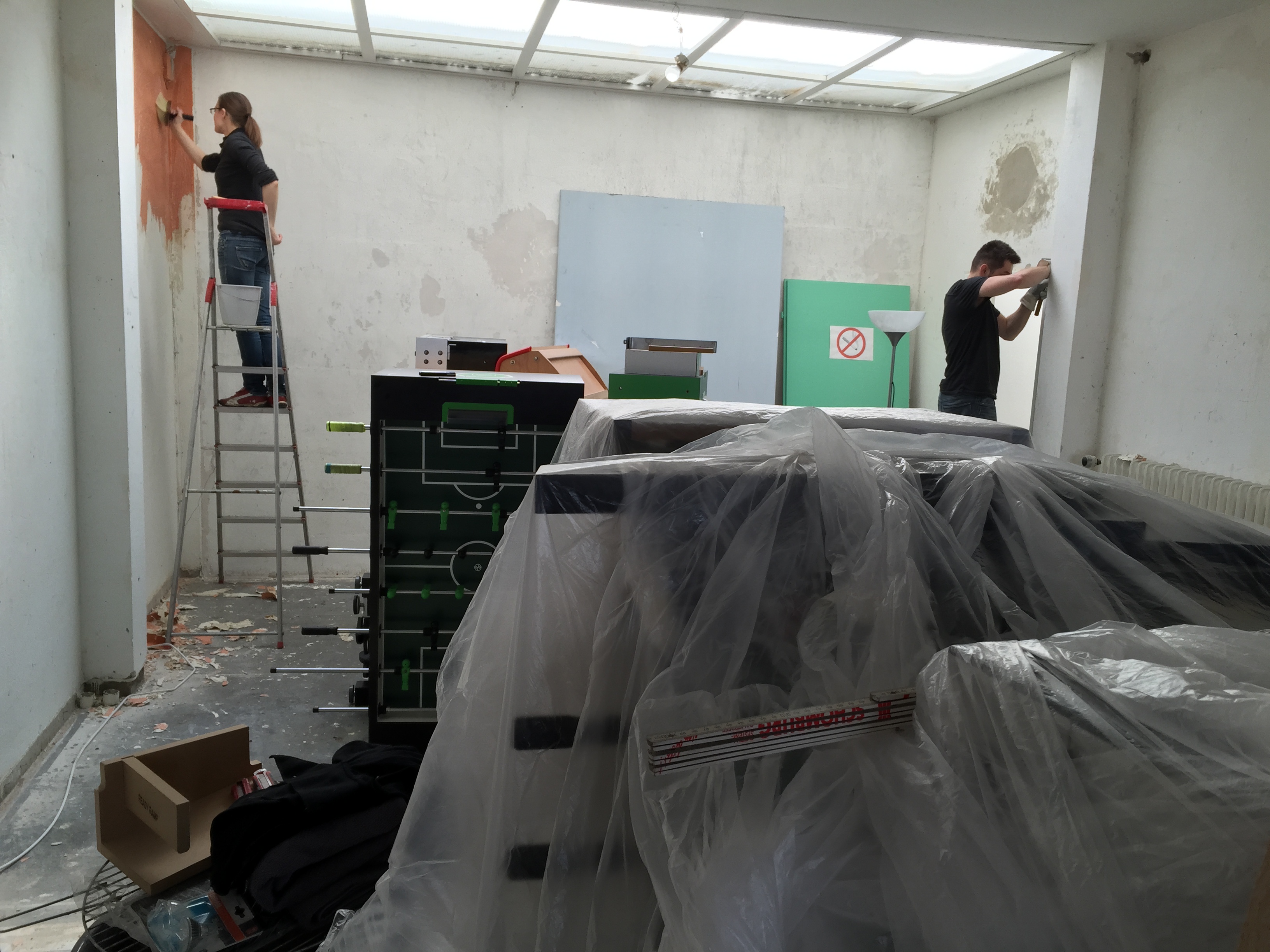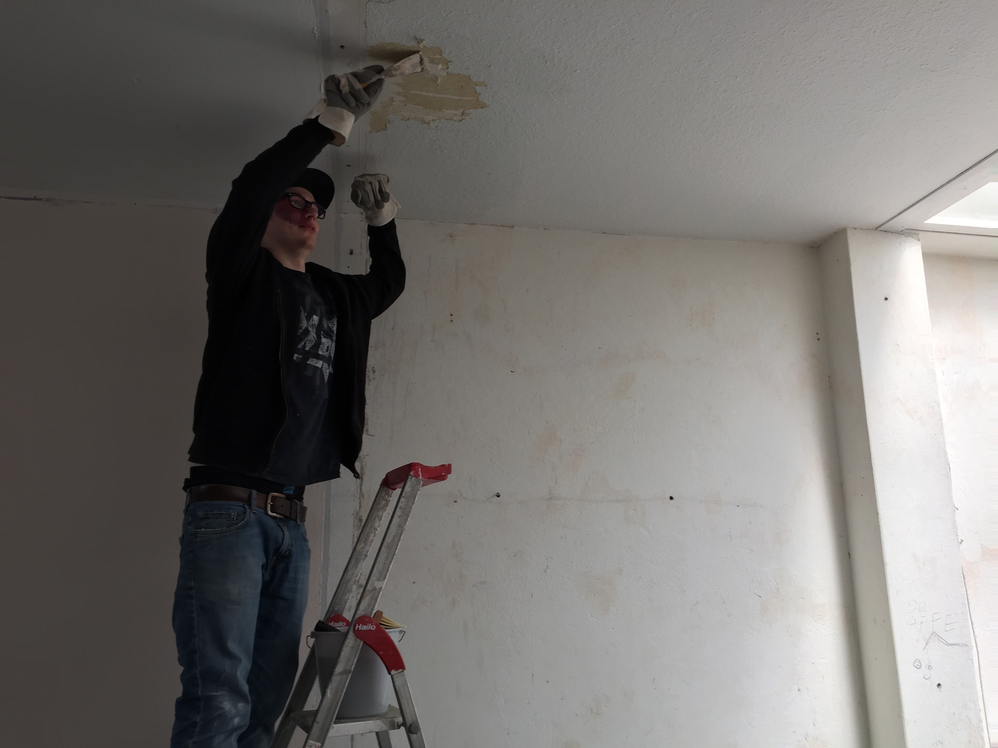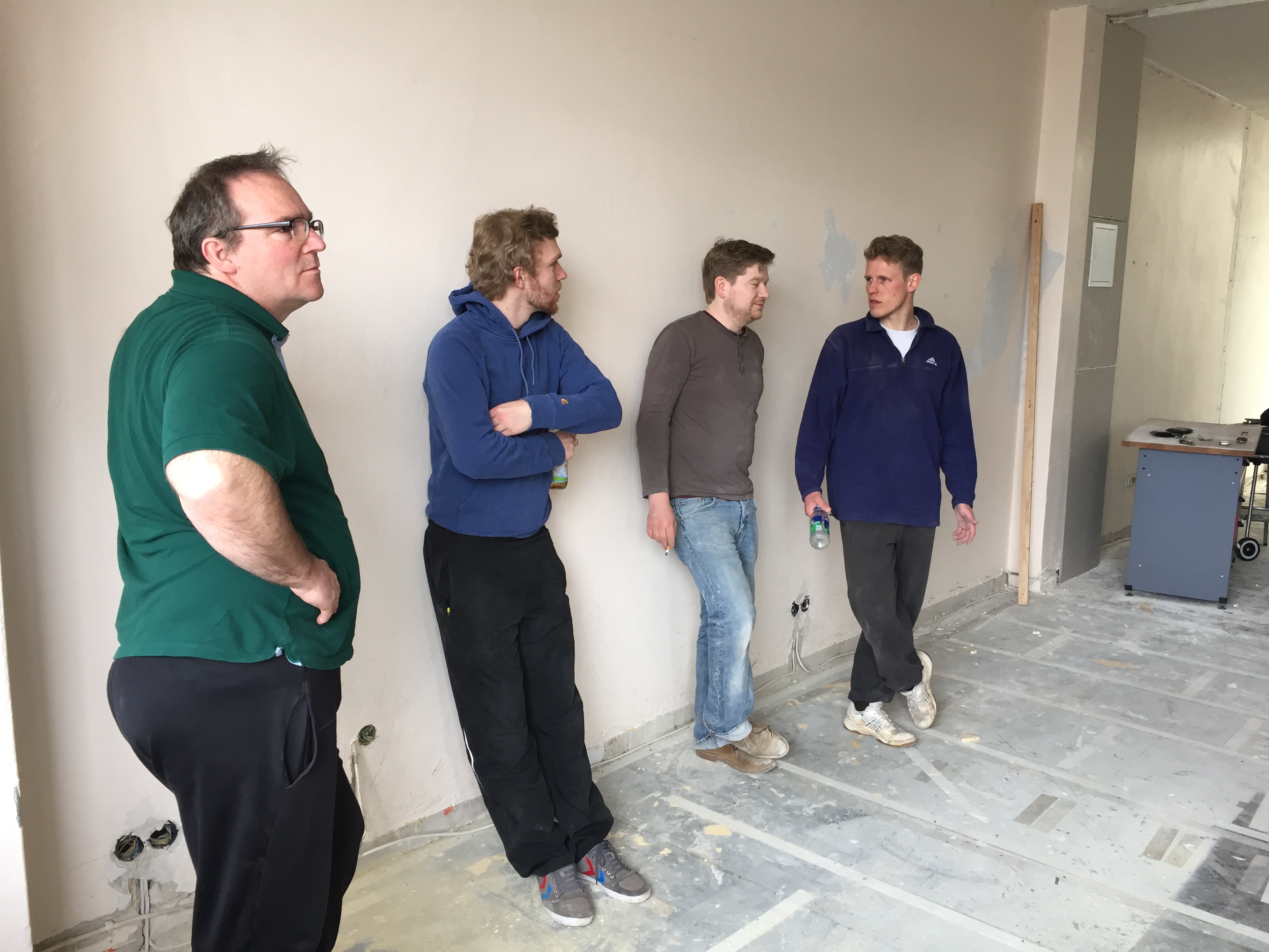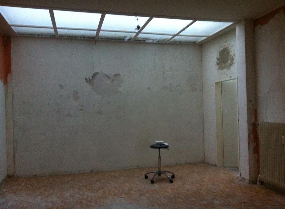 Am Donnerstag sah noch alles wie immer aus. Der geliebte süffige Boden, das ranzige Gardinengut, das Dyp-Final-Podest… Und schon heute ist alles in Schutt und Asche. Ein Container und ein Pferdeanhänger wurden voll gemacht. Alles Alte raus und Platz fürs Neue.