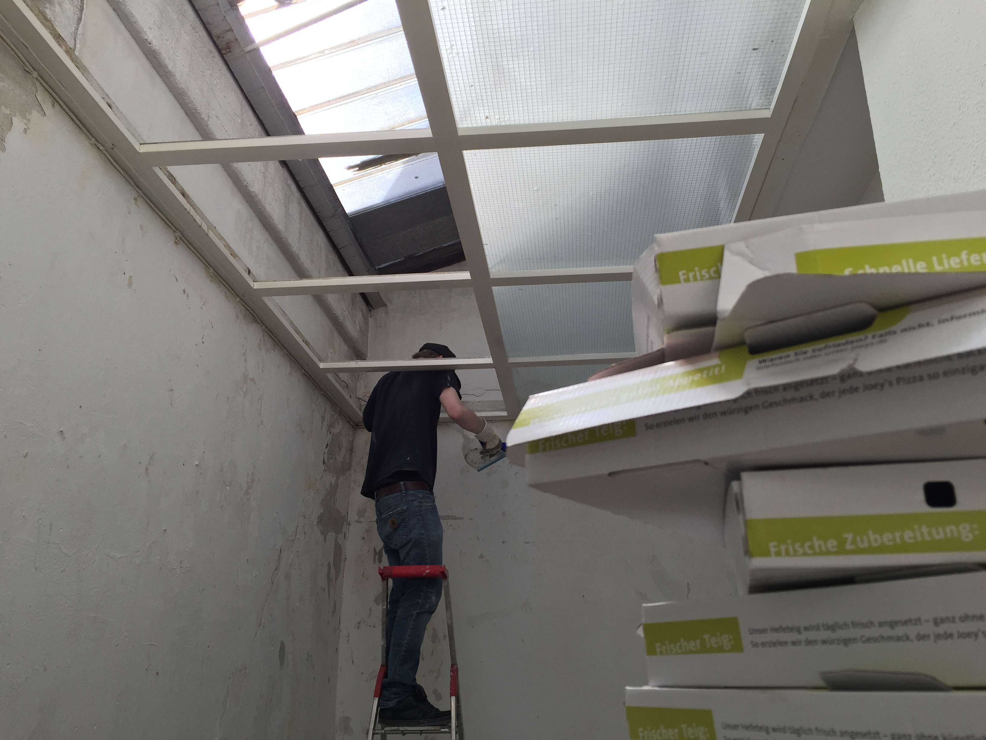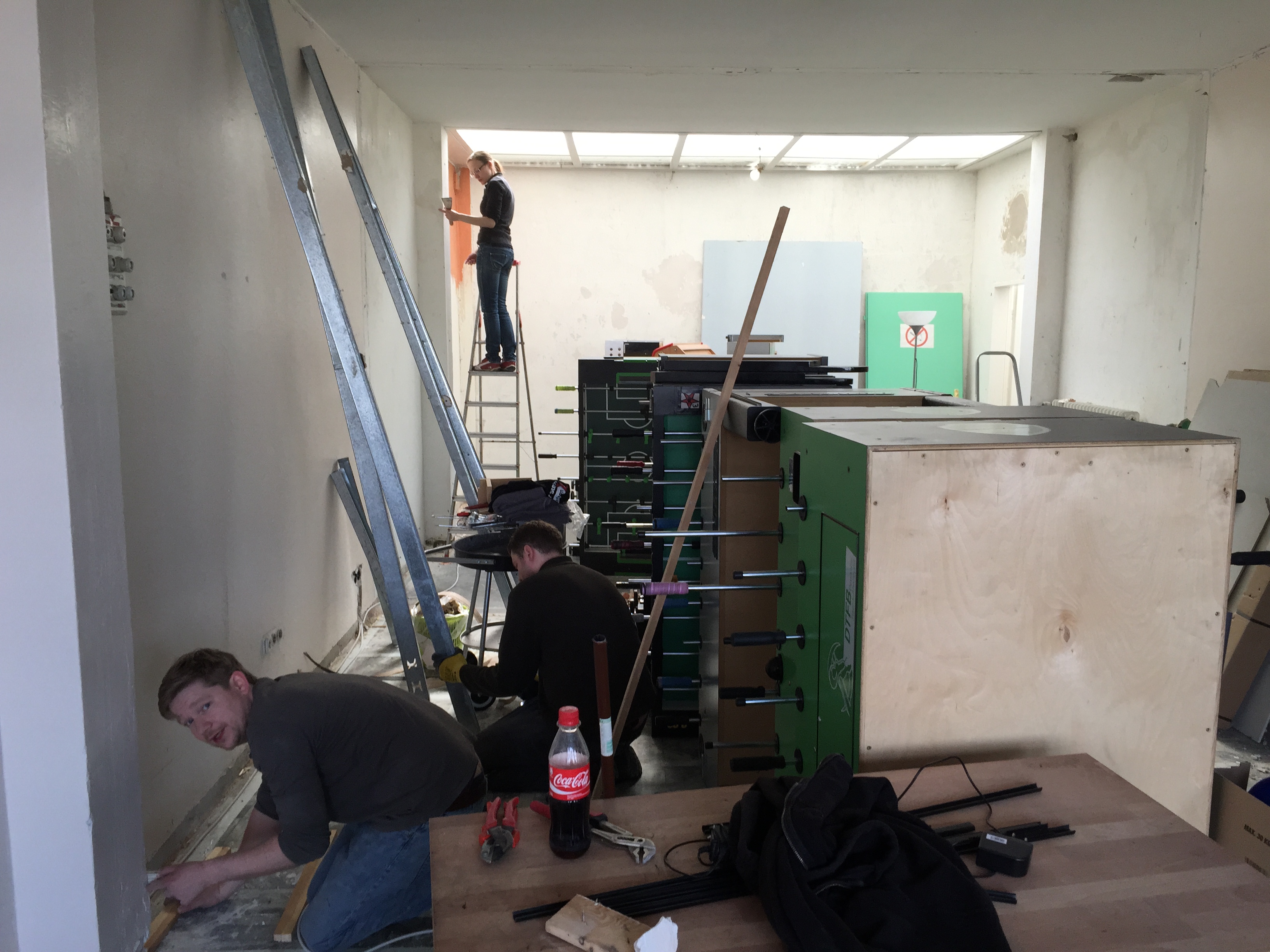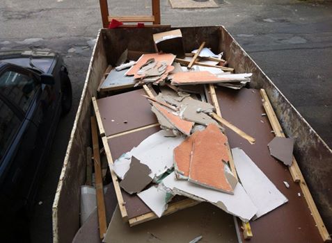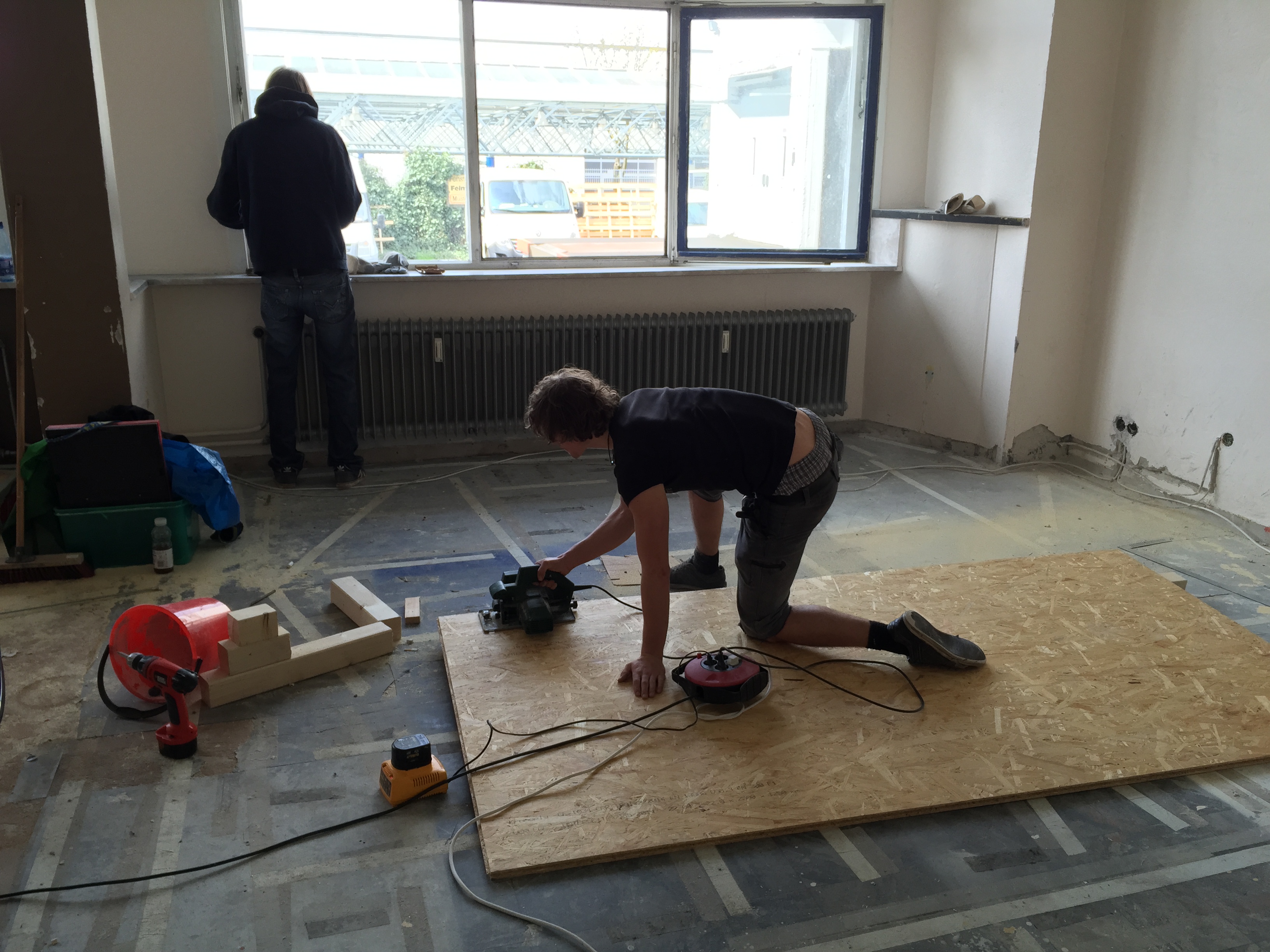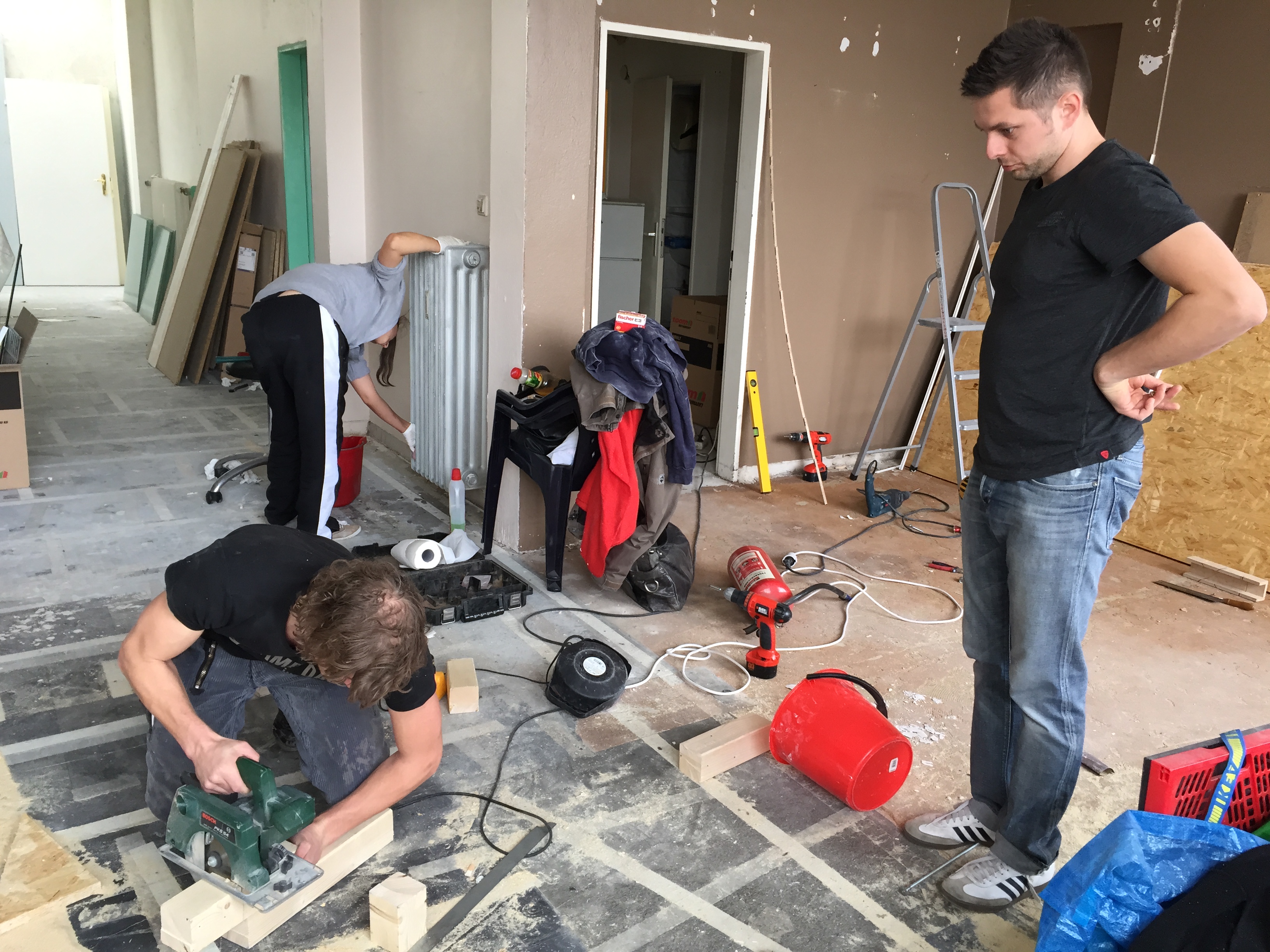 Am Donnerstag sah noch alles wie immer aus. Der geliebte süffige Boden, das ranzige Gardinengut, das Dyp-Final-Podest… Und schon heute ist alles in Schutt und Asche. Ein Container und ein Pferdeanhänger wurden voll gemacht. Alles Alte raus und Platz fürs Neue.